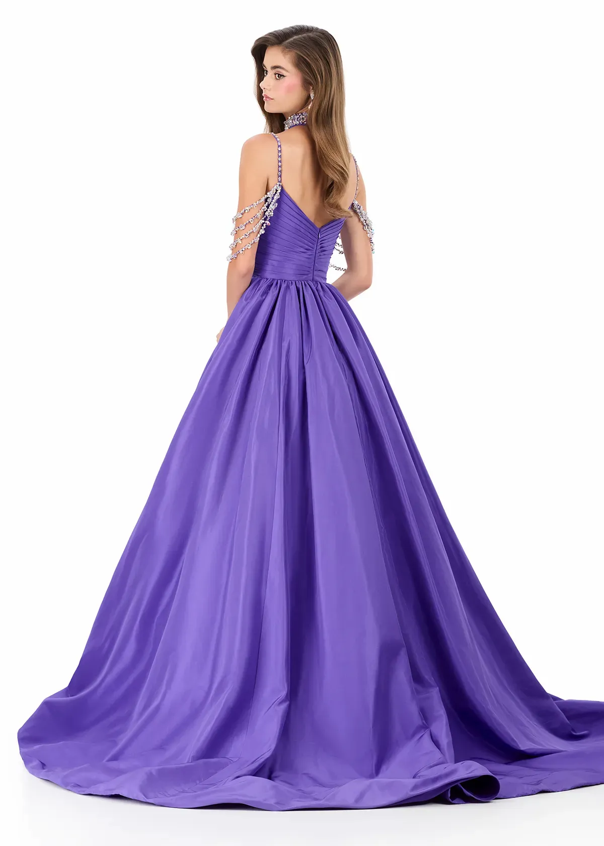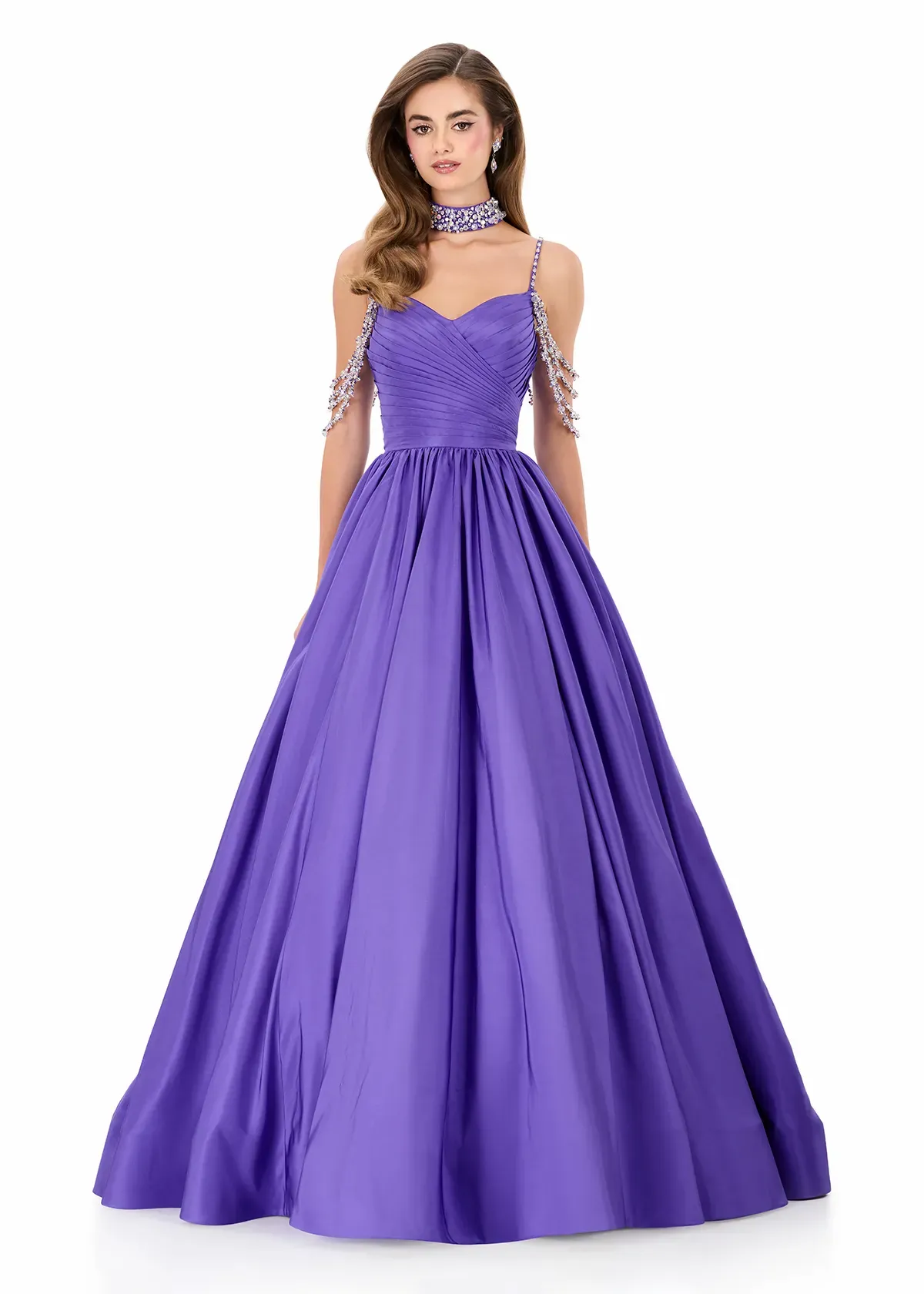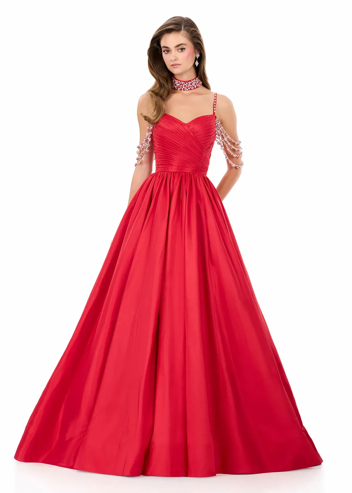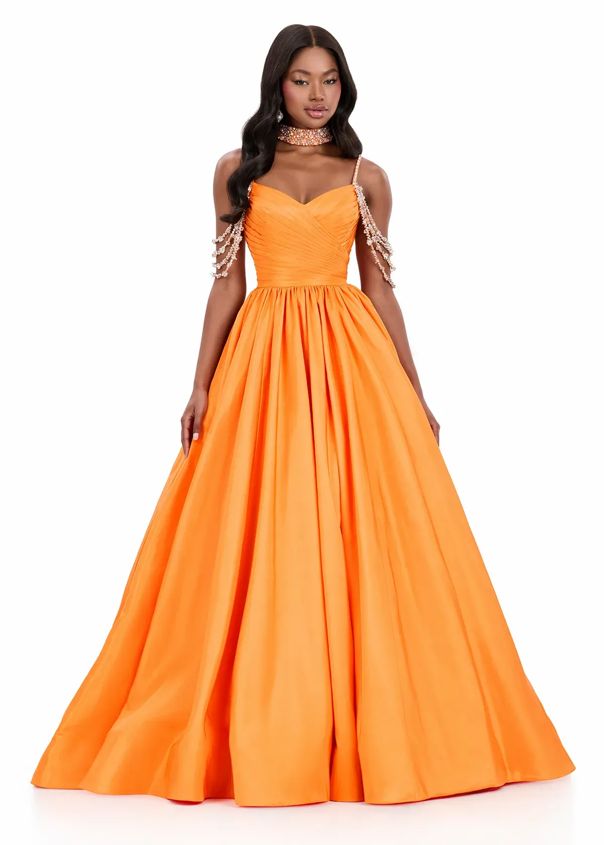 Make a statement in ASHLEYlauren Style 12300, a breathtaking ball gown designed to deliver show-stopping glamour at every angle. Crafted in luxurious taffeta and adorned with sparkling embellished straps, this gown is the epitome of dramatic elegance and unforgettable presence.