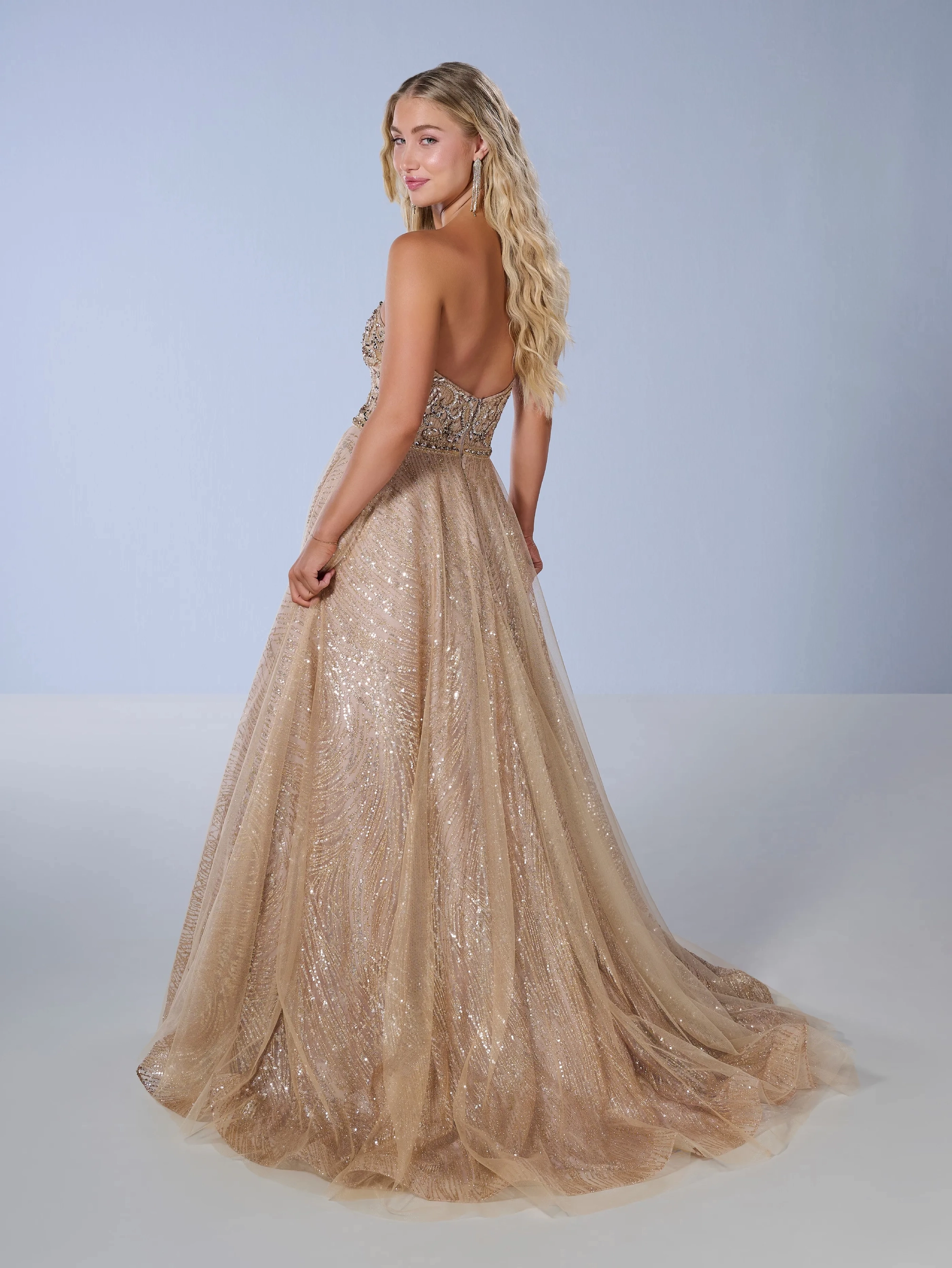 A ball gown made out of sequin fabric with a sweetheart strapless top and detachable sleeves for an elegant touch.